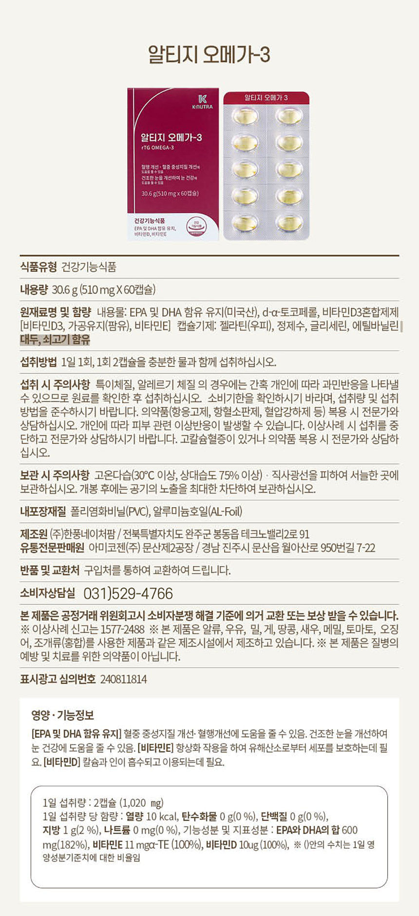 케이뉴트라 알티지오메가3 혈행 건강 목넘김 편한 캡슐(510ml 60캡슐)5통
