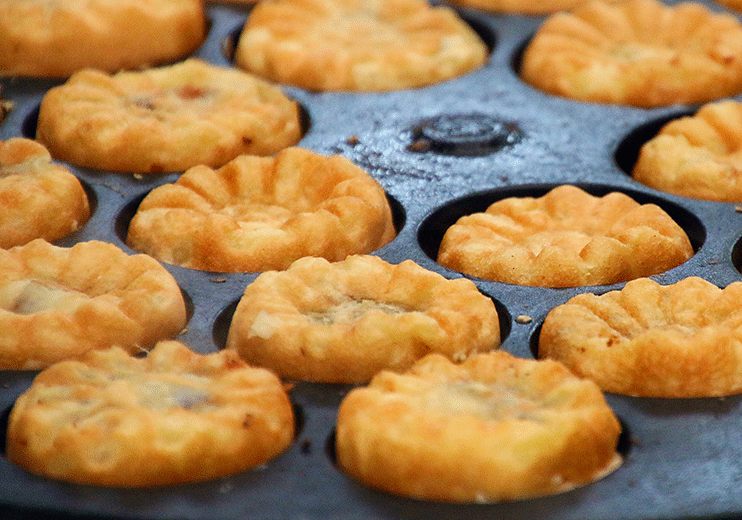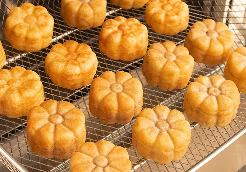겉면은 바삭하지만 속은 촉촉한 식감이 매력적이에요. 국화빵마다 달달한 팥앙금과 슈크림이 가득 차 있습니다. 한 입 크기로 되어있어 간편하게 먹을 수 있어요.