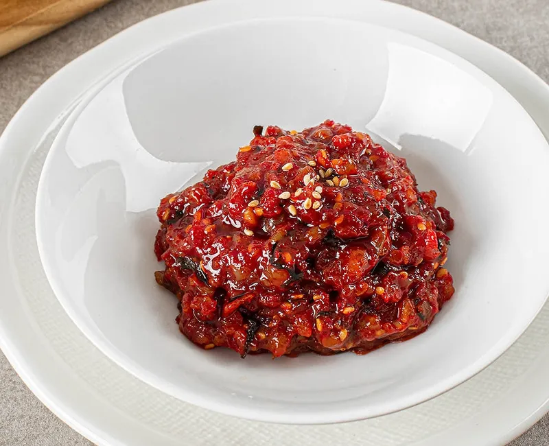 탱글탱글하고 부드러운 오징어를 섬세하게 잘게 다져 만든 비빔 오징어젓입니다. 고춧가루와 양파를 넣어 매콤하고 짭짤한 맛을 더했어요. 깊고 풍부한 감칠맛이 느껴지는 반찬으로 밥맛을 크게 돋워줍니다.