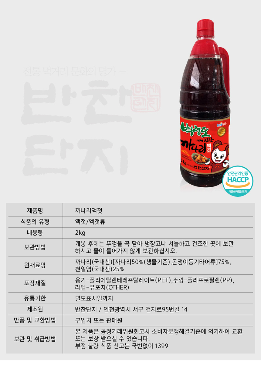 [G] 반찬단지 까나리액젓 2kg 밑반찬종류 저녁메뉴 반찬가게