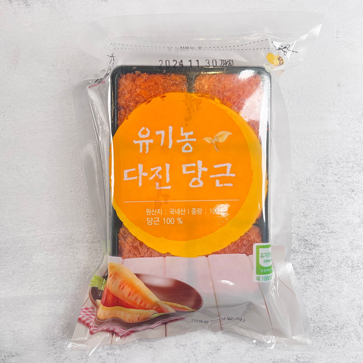 당근 껍질을 수작업으로 제거하여 사용합니다. 유기가공식품 인증을 받은 상품입니다.