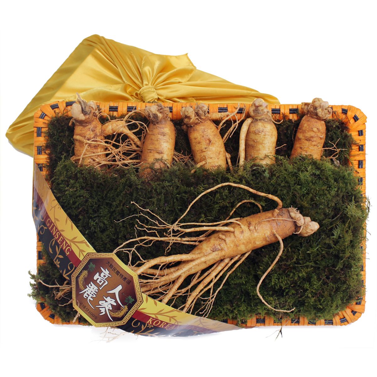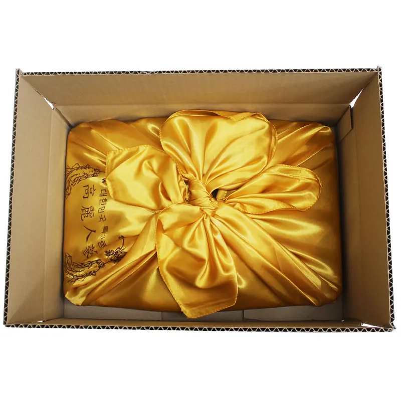등바구니 채반에 인삼을 놓고 금보자기로 한 번 싸서 보내드립니다.