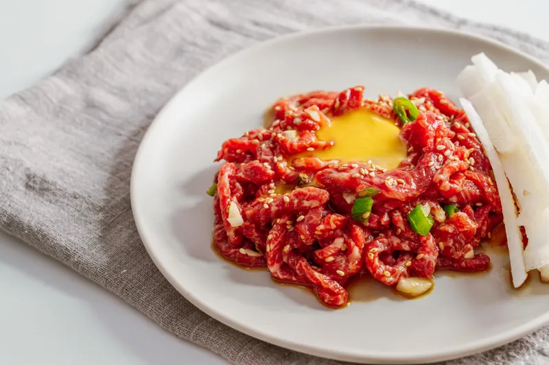 부드러우면서도 쫀득한 식감을 자랑하는 우둔살 부위를 사용한 육회입니다. 우둔살은 지방과 마블링이 적어 뭉티기, 육사시미, 육회로 많이 사용됩니다.