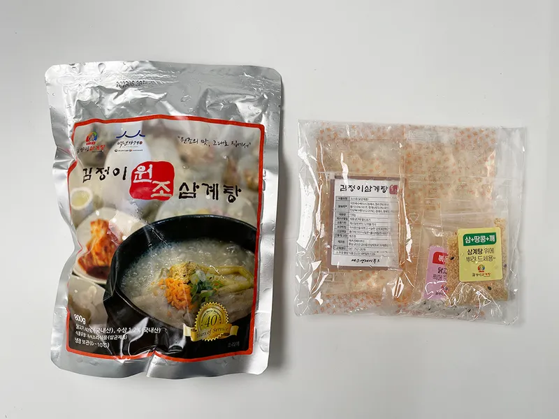 1팩에는 삼계탕 800g, 삼계탕 비법육수. 소금, 인삼&땅콩가루가 포함됩니다.
