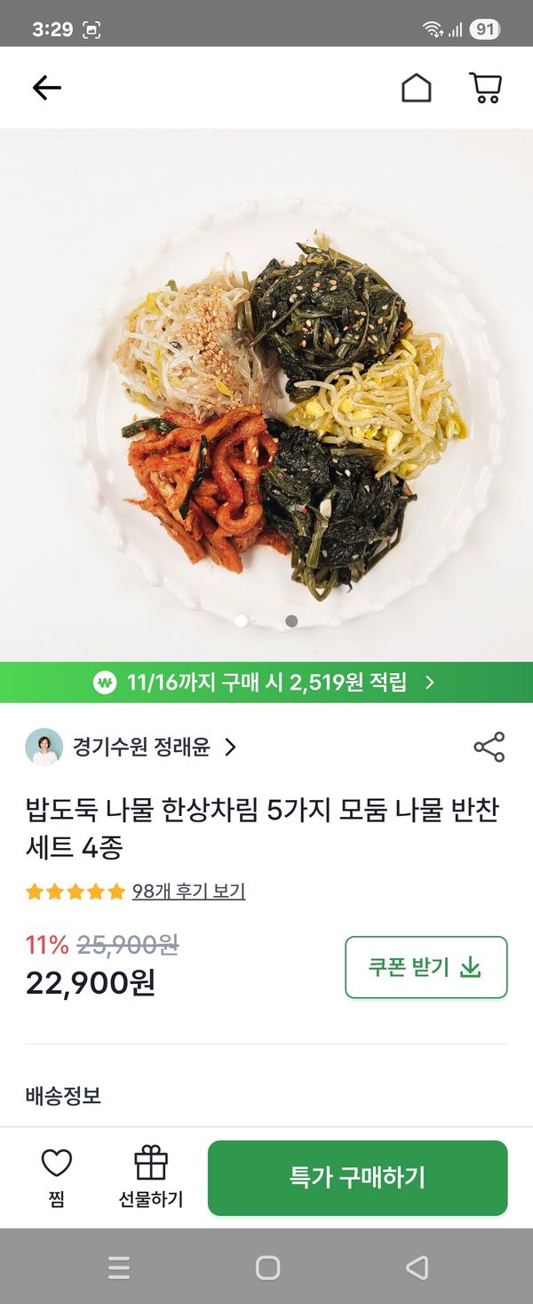 반찬은 다 맛있어요 아쉬운건 무채나물의 국물이 넘쳐 밖으로 새어나와 박스가 지저분하게 배송되었어요 나물들은 정말 맛있습니다