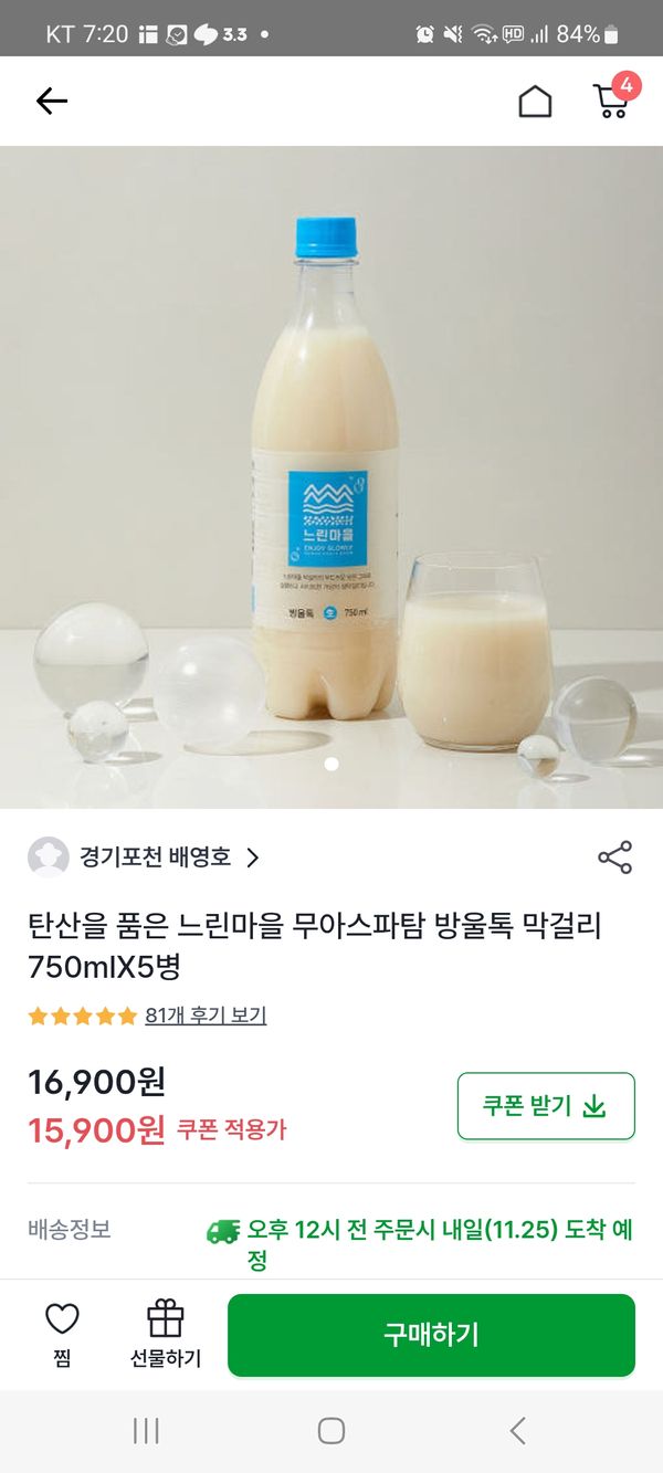 탄산을 품은 느린마을 무아스파탐 방울톡 막걸리 좋아요. 재구매제품 대상중 하나 포함