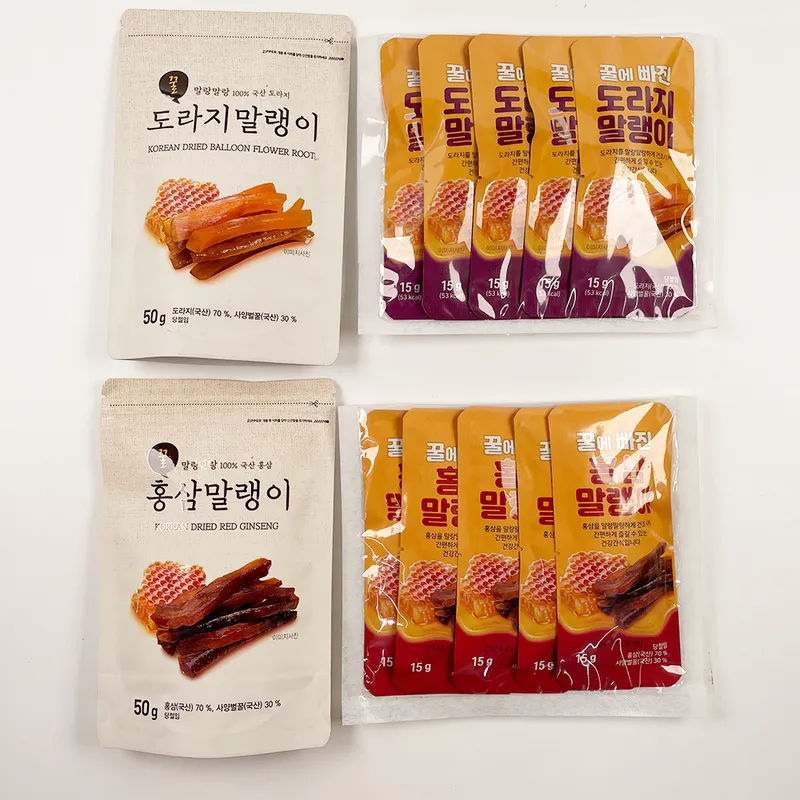몸에 좋은 홍삼과 도라지를 말랑말랑하게 건조시켜 맛과 영양을 모두 잡은 말랭이입니다. 입이 심심할 때, 죄책감 없이 또 부담 없이 즐기기 좋은 영양만점 간식이죠. 온 가족 건강하고 맛있게 즐겨보세요🙌