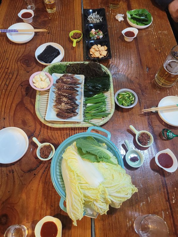 과메기를 맛있게 먹을 수 있도록 세트로 구성되어 있어요. 김에 야채를 얹어서 싸먹으니 맛있어요 양도 푸짐함니다