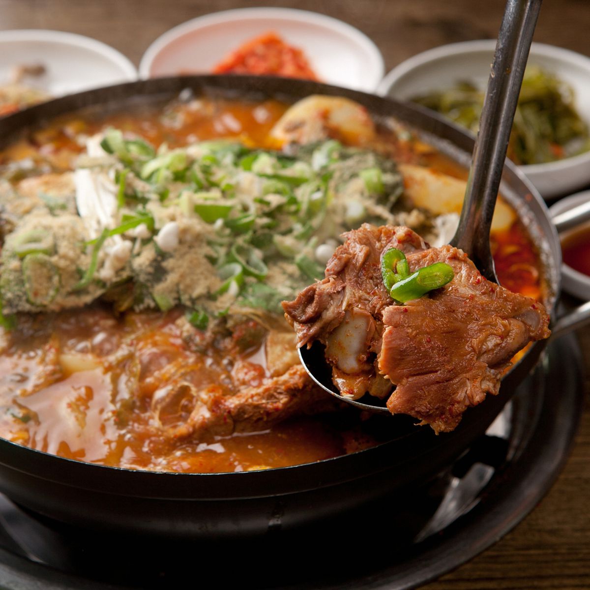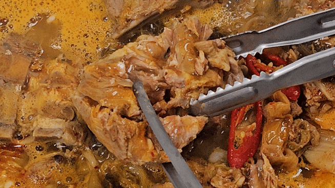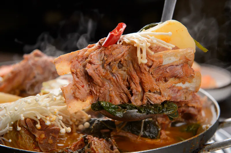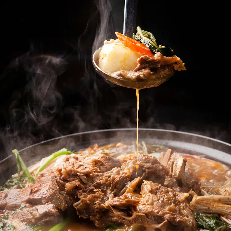 뼈만 덩그러니 있는 감자탕과는 다릅니다. 살이 야무지게 붙은 국내산 돼지 등뼈로 쫀득하고 고소한 식감을 느낄 수 있어요. 끓일수록 깊어지는 국물 맛에 고기도 국물도 아깝지 않은 한 팩이에요.