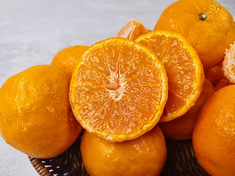 껍질이 두꺼워 손으로도 쉽게 까지는 카라향! 새콤달콤한 맛의 조화가 좋은 품종이에요. 탱탱한 과육에 한입 먹으면 터지는 풍부한 과즙이 특징이죠.