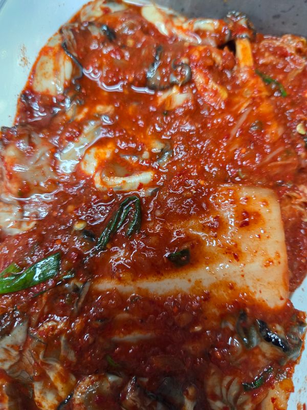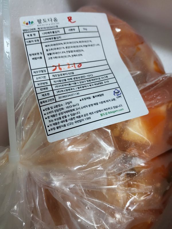 스티로폴 상자안에 국물이 조금 새어 나왔어요. 김치 국물 첫맛이 좀 매콤해서 걱정했는데 냉장고에 하루 뒀다가 먹으니 매운맛이 사라져서 먹기 좋은 상태가 됬습니다.