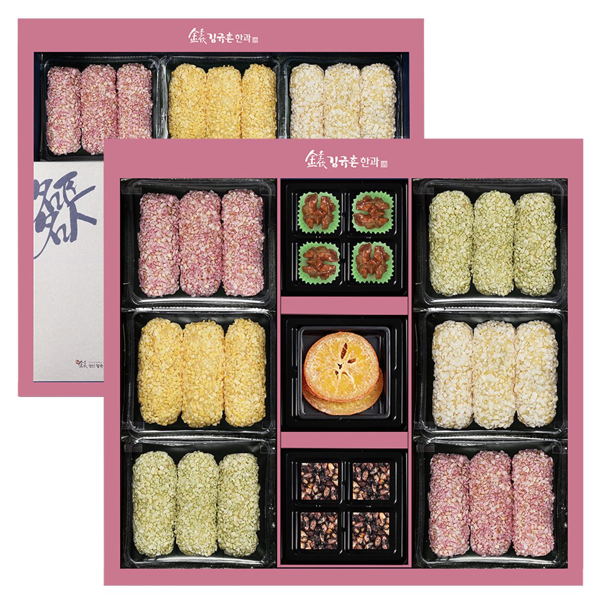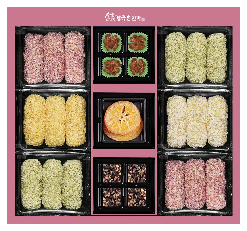 [유과] 찹쌀, 백련초, 단호박, 뽕잎 / [강정] 흑미, 호두 / [정과] 귤 구성입니다.