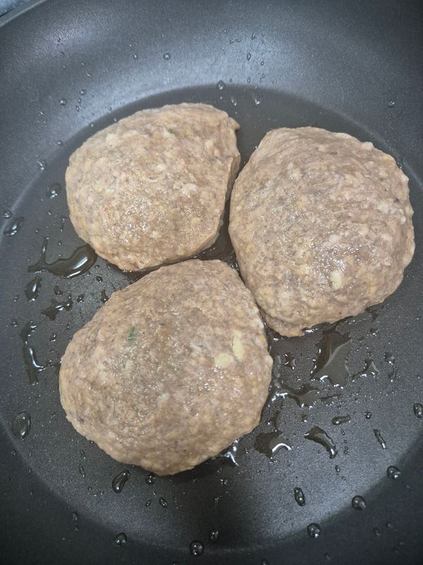 아들이 밥버거를 좋아하는데 거기에 넣어서 먹으면 넘 맛있는 떡갈비입니다 팬에 귑기는 모양이 어렵게 만들어져 있어서 에어프라이기에 구워서 먹으면 맛있어요