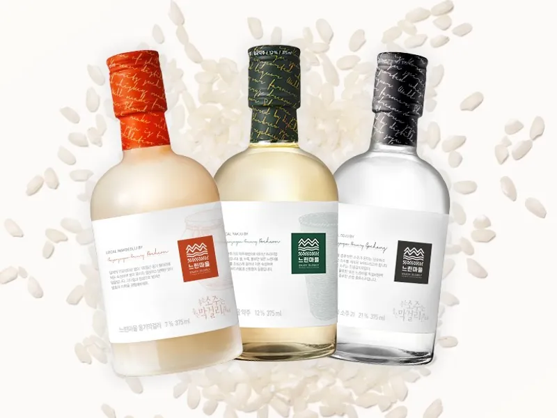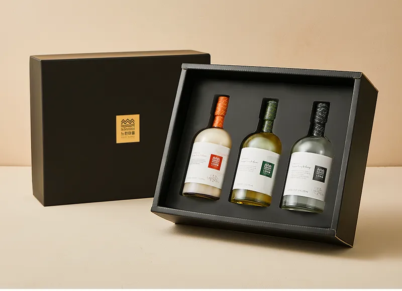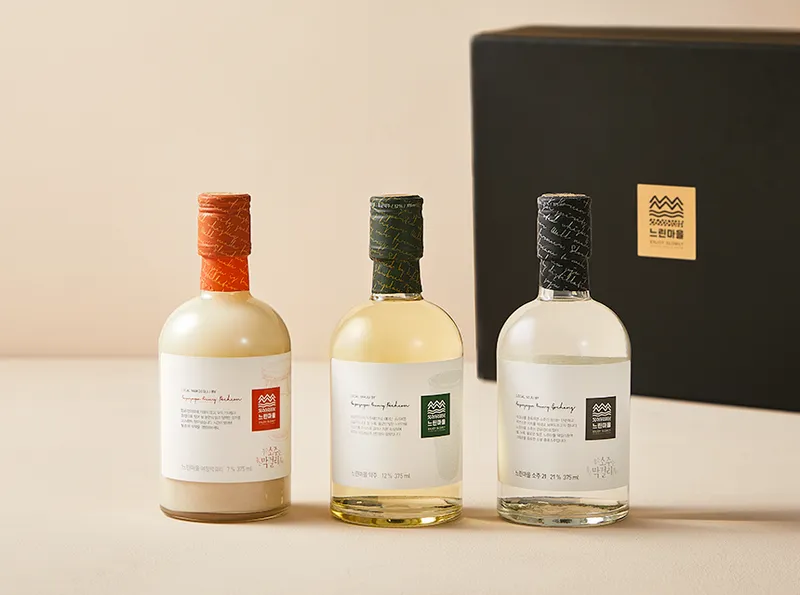 선물세트인 만큼 세 가지 술을 더욱 품격 있게 담아냈습니다. 주는 사람도 받는 사람도 모두가 만족할 수 있는 세트 구성의 패키지로 고급스러움을 한층 더했어요. 막걸리부터 약주, 소주까지 모두 만날 수 있는 느린마을 선물세트를 선택해 보세요.