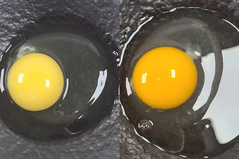A. 달걀은 닭이 먹는 사료에 따라 노른자 색이 다릅니다. 유기사료의 옥수수 색이 좀 연합니다. 그리고 쌀겨, 청치는 발색하지 않습니다.