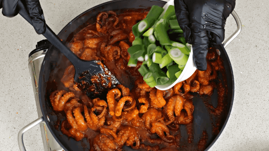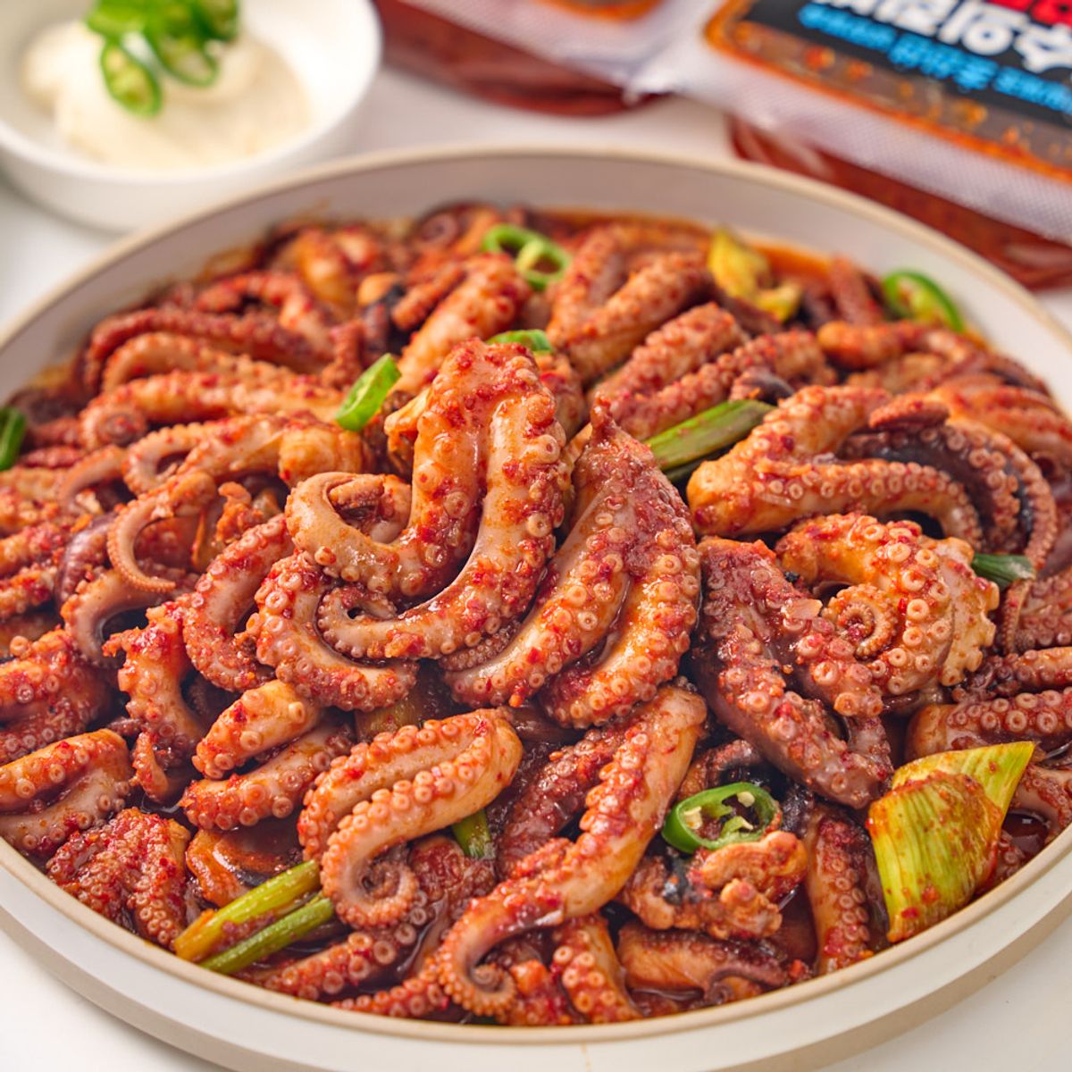 강불에 가볍게 볶아주기만 하면 완성! 누구나 쉽게 맛집 못지않은 쭈꾸미볶음을 만들 수 있어요! 매콤하면서도 쫄깃쫄깃한 쭈꾸미 식감에 밥 한 공기 뚝딱 비울 수 있습니다.