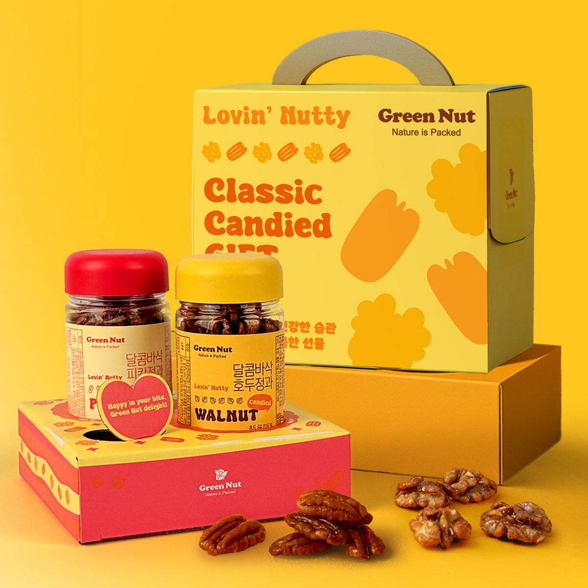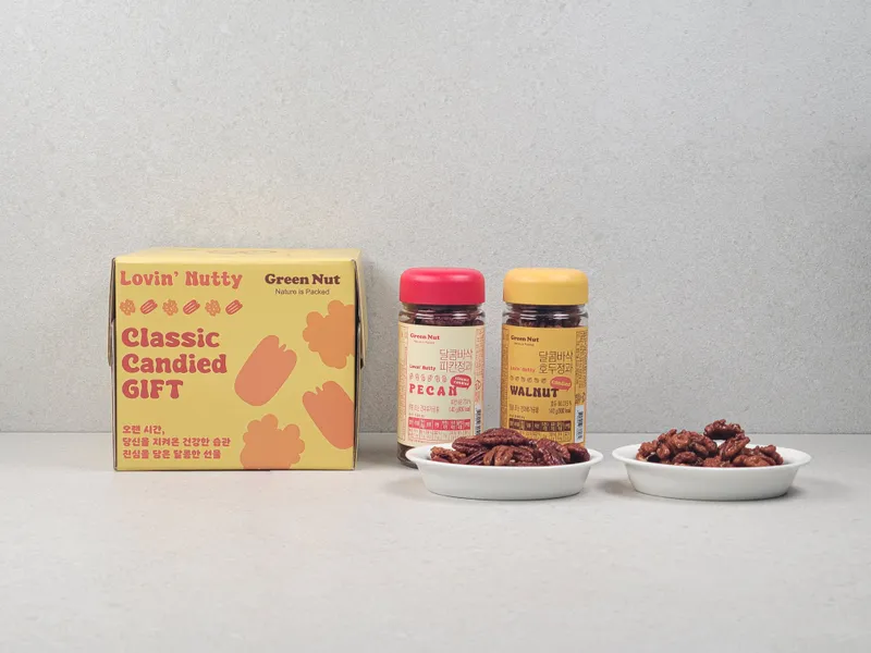 따뜻한 노란색과 분홍색의 감각적인 포장 박스로 젊은 감성을 자극하며 선물하기 좋은 느낌을 연출해요! 기존의 딱딱한 견과류 포장과는 차원이 다른 세련된 디자인으로 받는 분이 감동할 수밖에 없는 특별함을 선사합니다.