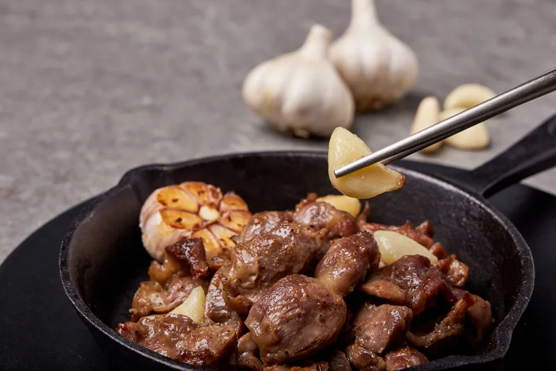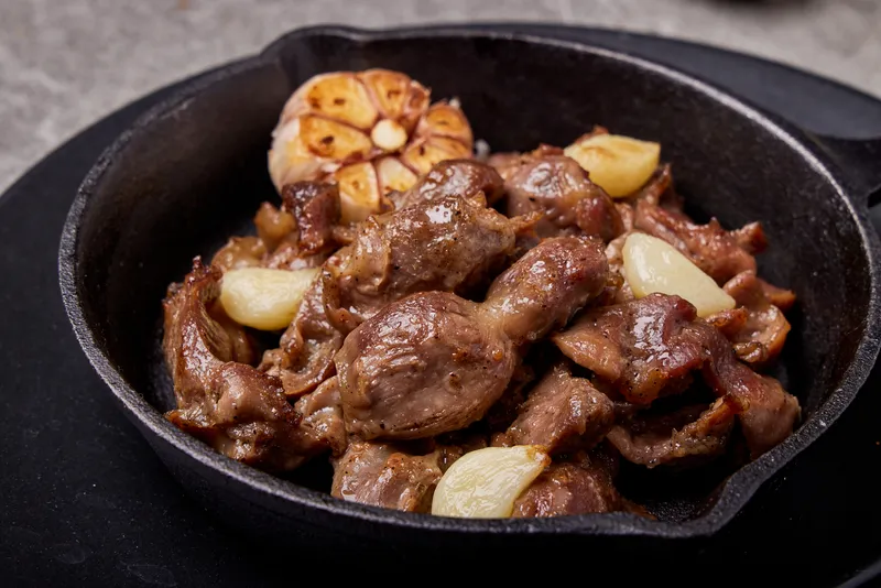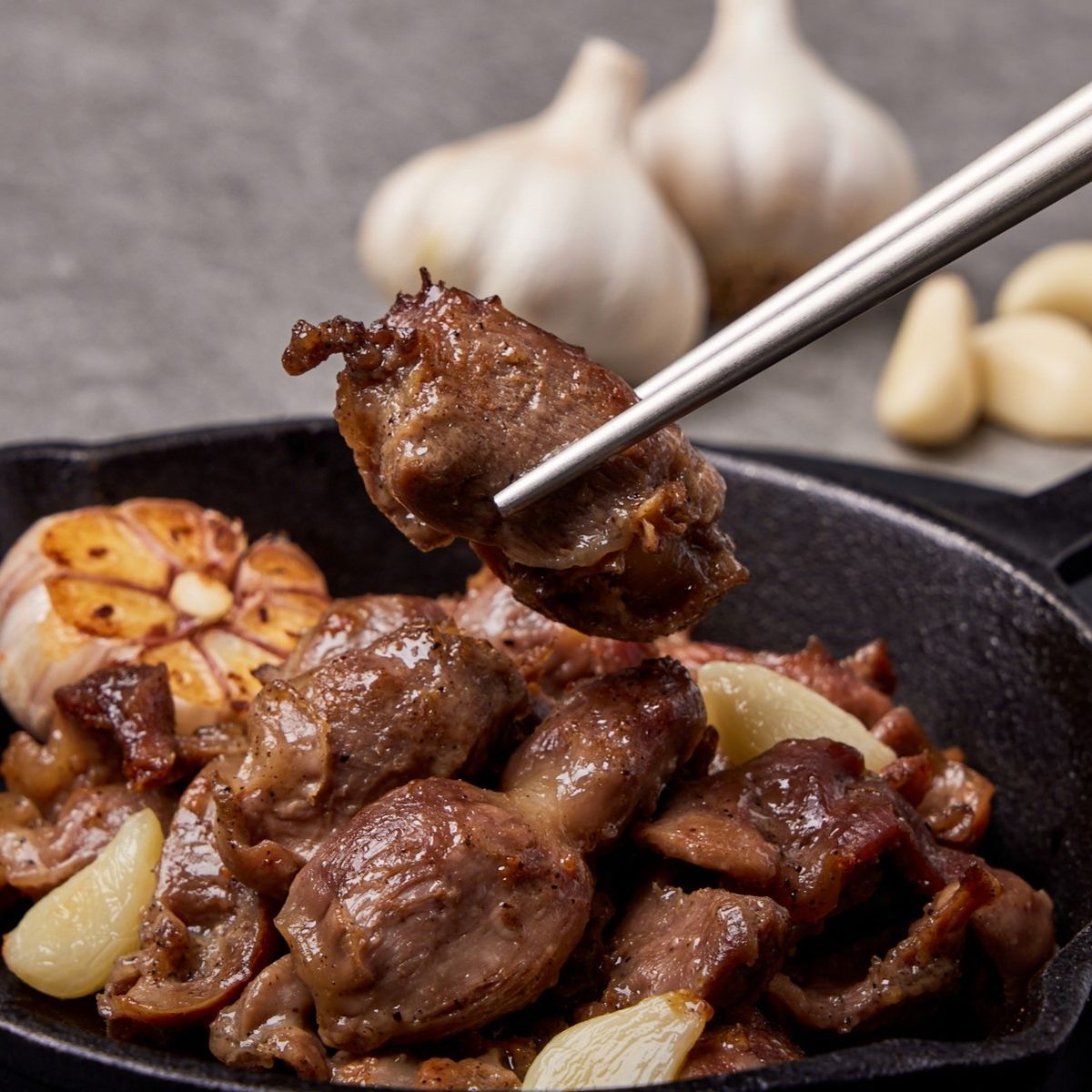 닭근위는 특이한 식감으로 잘 알려져 있죠. 오독한 식감에 통마늘을 첨가했습니다. 그냥 마늘이 아니에요. 통통한 통마늘을 넣어 느끼함은 전혀 없어요!