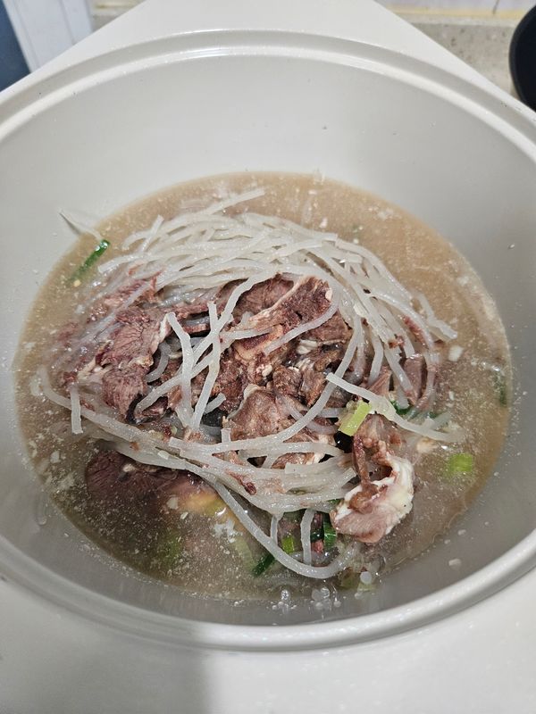 뼈에 붙은 고기는 좀 푹 끓여서 먹음 더 부드러울것 같아요. 근데 당면이 같이 들어가 있는걸 함께 끓이니 왕당면이 되었네요..담엔 귀찮아도 빼고 끓이다 넣어야겠어요.간도 되어있어서 간단히 먹기 좋아요.맛도 좋아요