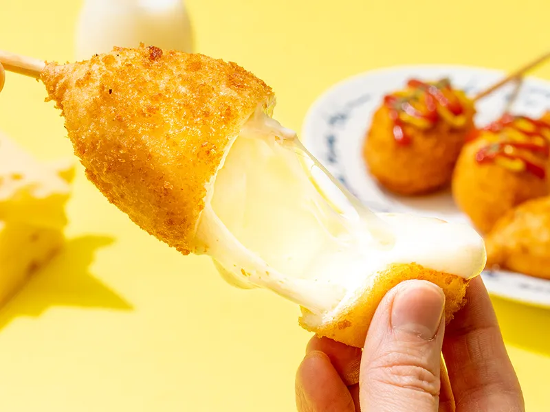 소시지가 들어간 핫도그도 맛있지만 반죽 속을 치즈로 꽉꽉 채워 한 입 먹는 순간 치즈가 쭈욱 늘어나는 핫도그는 또 다른 매력이 있죠.