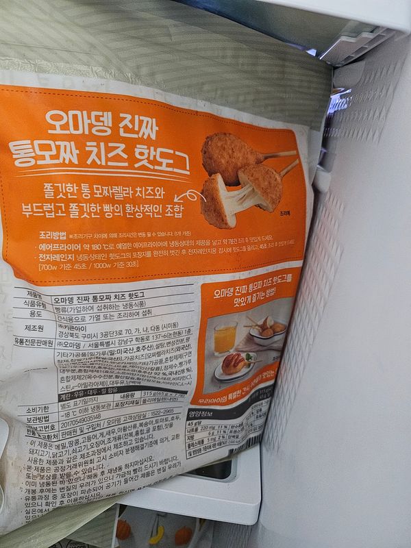 냉동 상태인 핫도그의 포장지를 완전히 벗긴 후 전자레인지용 접시에 핫도그를 올리고, 45초 조리 후 맛있게 드세요.