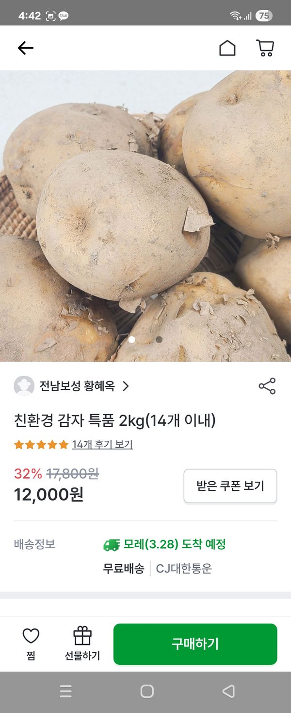 포슬하게 쪄서 먹으려고 주문했어요 감자를 주문하면 간혹 싹이 올라온 감자를 받는경우가 있는데 요감자는 싹도 안올라오고 상처도 하나없이 신선하네요 굵기도 적당하고... 맛있게 잘 먹을께요