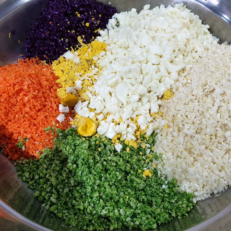 우리 아이가 먹는 음식인데 재료를 아무거나 쓸 수는 없죠. 제주 햇 감자와 양계장에서 직배송한 계란, 유기농 설탕, 유기농 송화소금을 사용합니다. 여기에 국산 채소 6가지, 당근, 감자, 적채, 양배추, 양파, 브로콜리를 더해 맛과 식감을 더했습니다.