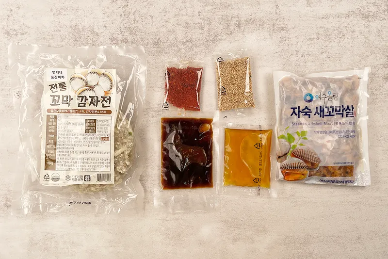 상품은 싱싱한 국내산 새꼬막과 특제간장소스, 들기름, 깨, 고춧가루, 감자전으로 구성됩니다. * 밥과 야채는 포함되어있지 않으니 별도로 준비해 주세요.