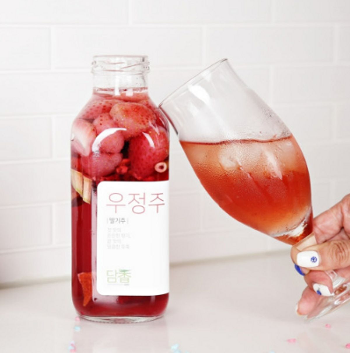 딸기향이 향긋해요 하루가 지나면 술이 조금 줄어들어서 조금 더 부어주었어요 색이 예쁘게 우러나와요 너무예뻐서 마실수있을지 모르겠어요~