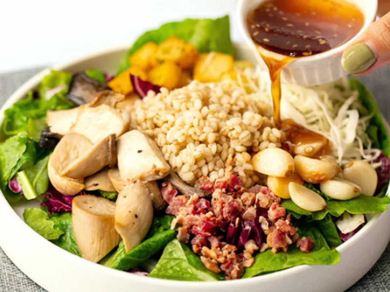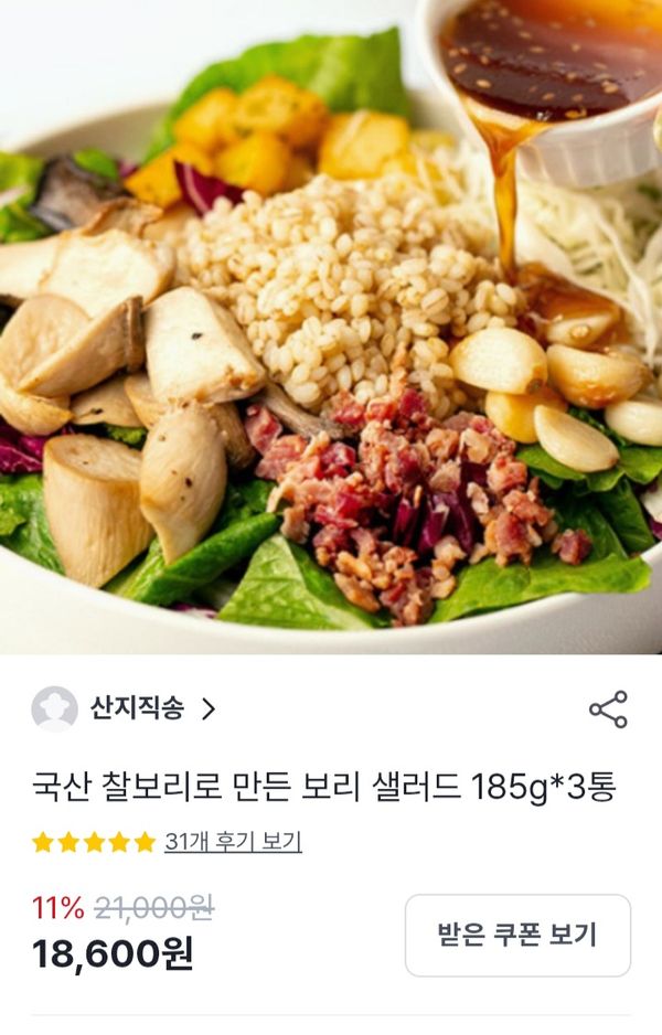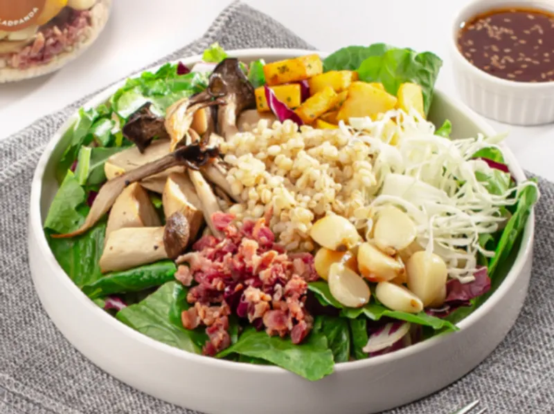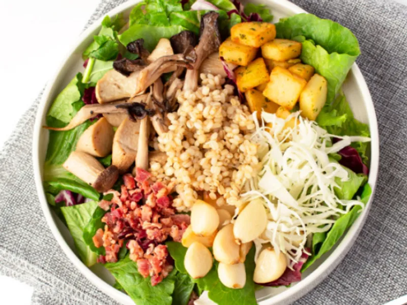식이섬유가 풍부한 보리뿐만 아니라 풍부한 풍미를 살려주는 토핑이 무려 7개! 느타리버섯과 새송이버섯을 구워 넣어 진한 고소함을 더했습니다. 거기다 마늘, 베이컨, 양배추, 감자 등을 넣어 한식 좋아하시는 분들 입맛 저격한 곡물 샐러드입니다.