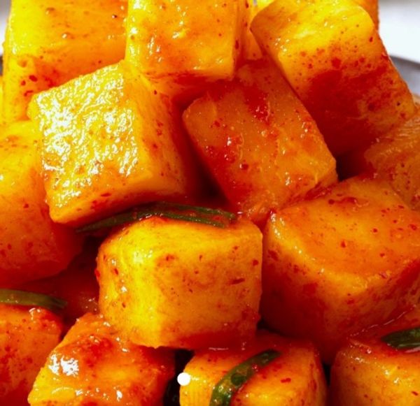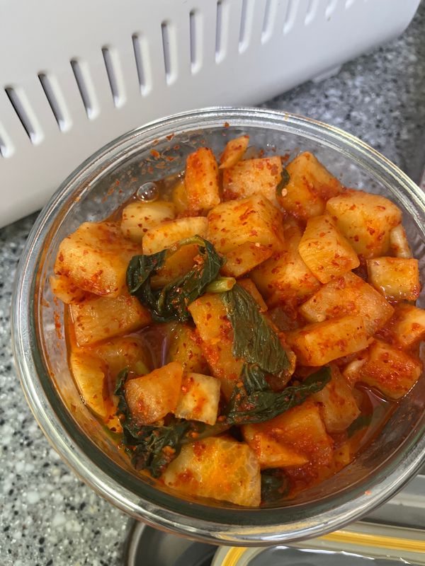후기보고구매했어요.도착후바로먹어보니싱싱하고아삭한데조금단맛이~깍두기가익으면어떨지모르지만맛있을거라기대합니다