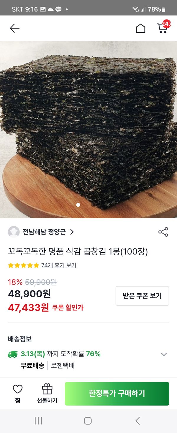 김이 너무 맛있어요ᆢ 다른김 사먹다가 다시와보니 허럴~~~ 가격이 거의 2배나ᆢ 이케 올리시면 무셔여 착한가격 좋은구매 부탁