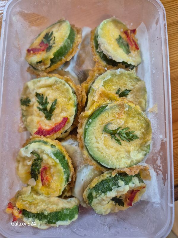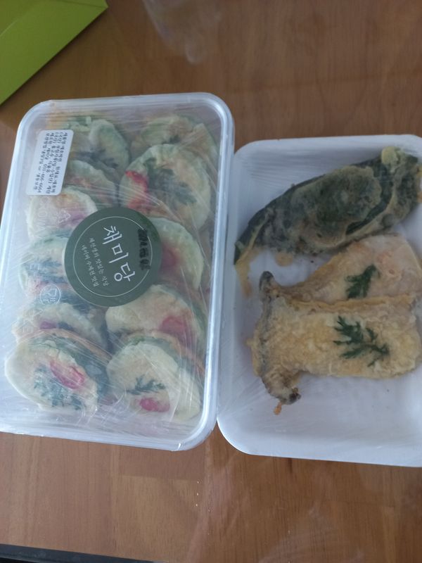 아직 맛보기 전이예요. 포장에서 보이는 빨간고추와 잎이보이는 호박전이 먼저 눈에 들어왔어요. 맛보기로 보내주신 깻잎전과 새우전1개씩 먹어보니 호박전 맛은 안보고도 맛있겠네요.