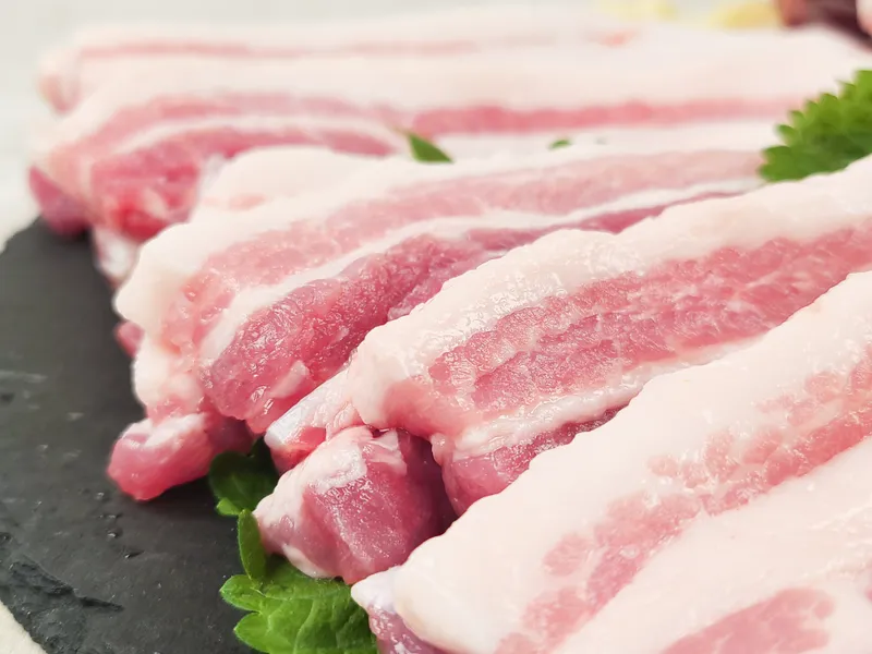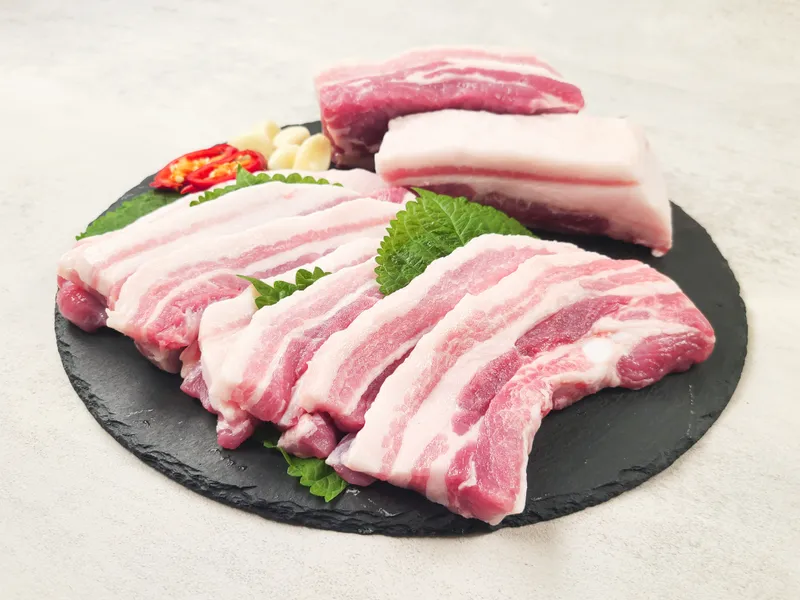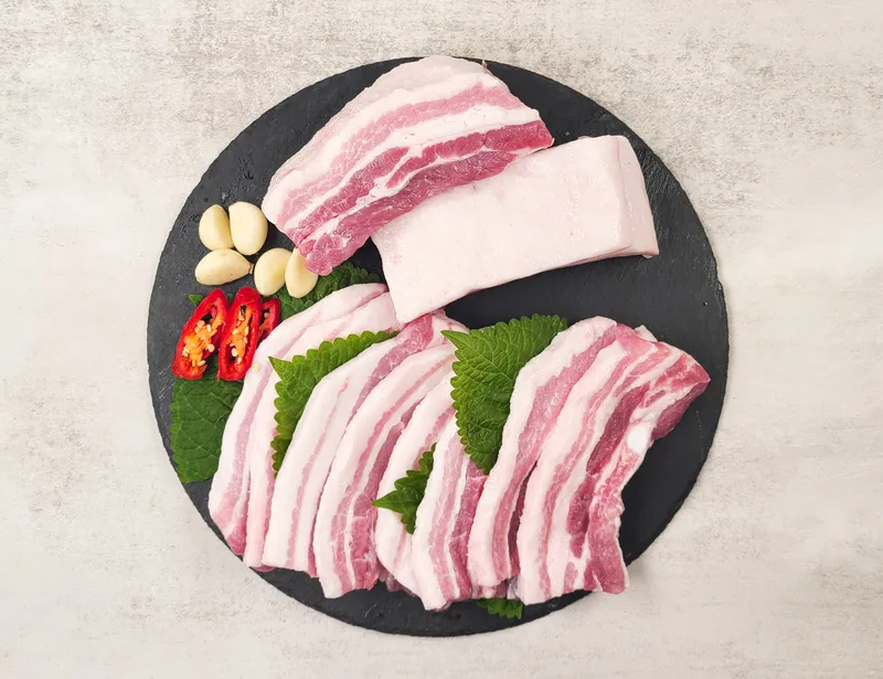돼지고기 중 가장 사랑받는 삼겹살! 적절한 지방 함량과 근섬유의 조화로 고소하고 육즙이 가득해요.
