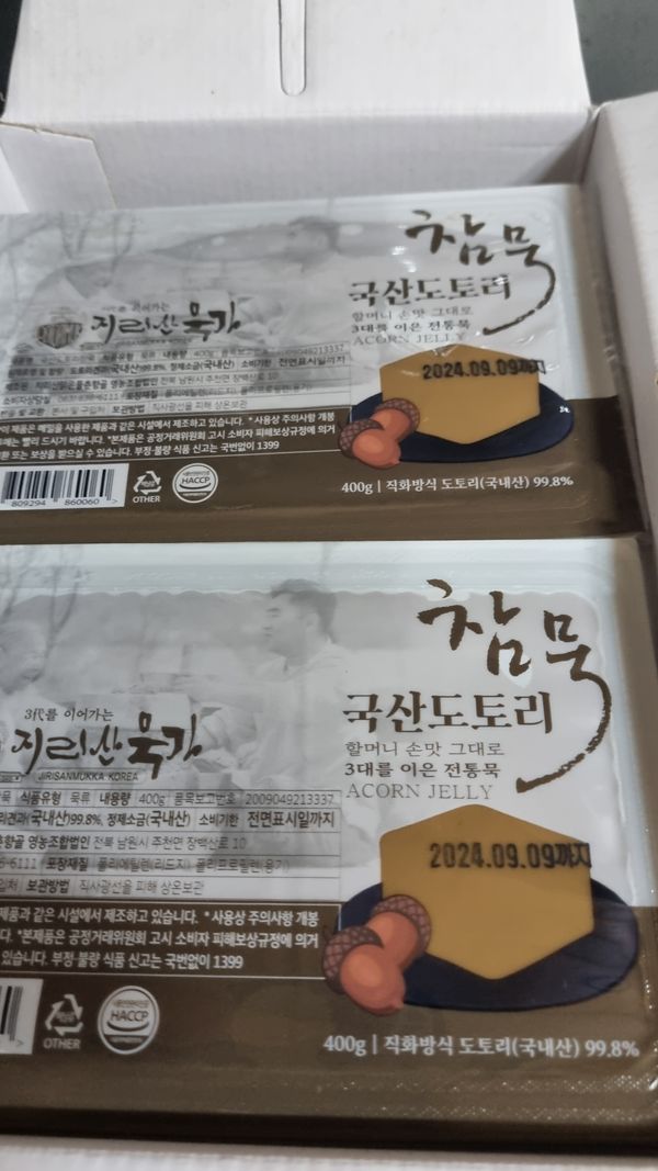 진짜 수제 백프로 도토리묵 맛는거 같아요 엄마가 도토리묵 좋아하셔서 3대째 내려오는 묵집 이라길래 믿고 주문해봤는데 너무 만족합니다. 여지껏 먹어본 묵중 단연 최고예요 앞으로도 쭉 질 좋은 도토리묵 만들어주세요 맛있게 잘먹었습니다 감사합니다~