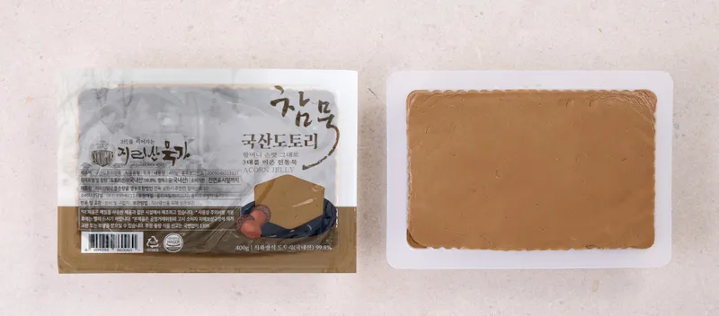 도토리묵의 탱글탱글함이 느껴지시나요? 100% 국산 도토리로 만들어 담백하면서도 진한 쌉싸름한 맛이 느껴지는 참 도토리묵입니다.