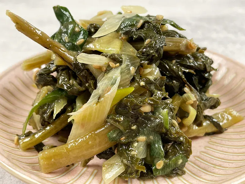 무청시래기를 구수한 된장 양념장에 자작하게 볶았습니다. 짜지 않고 슴슴한 맛에 자꾸 손이 가는 맛입니다.