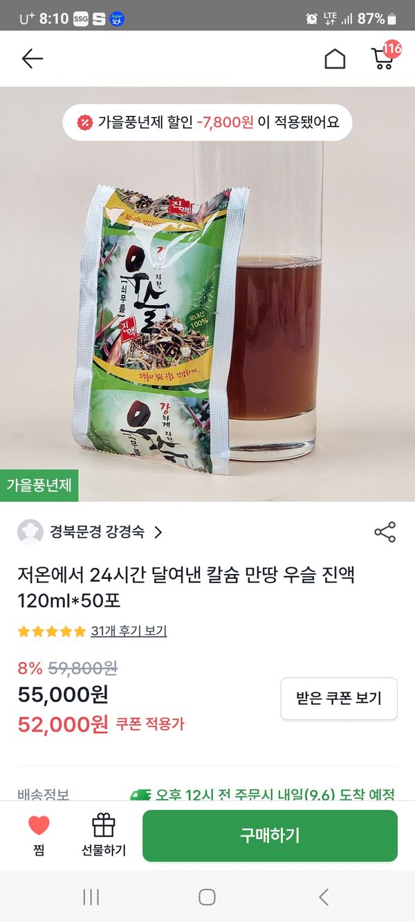 신랑 무릎이 안좋아 주문했어요 칡즙맛도 나는것이 먹기 편합니다 꾸준히 먹어보겠습니다