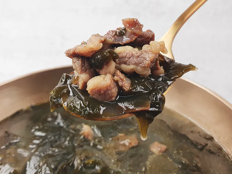 신선한 미역을 선별해 깨끗이 손질한 다음, 질 좋은 경북 영천산 한우 고기를 고소한 참기름에 달달 볶았습니다. 고소함의 정점을 찍어 깊은 맛을 내는 한우 미역국으로 남녀노소 모두의 입맛을 저격합니다🙌
