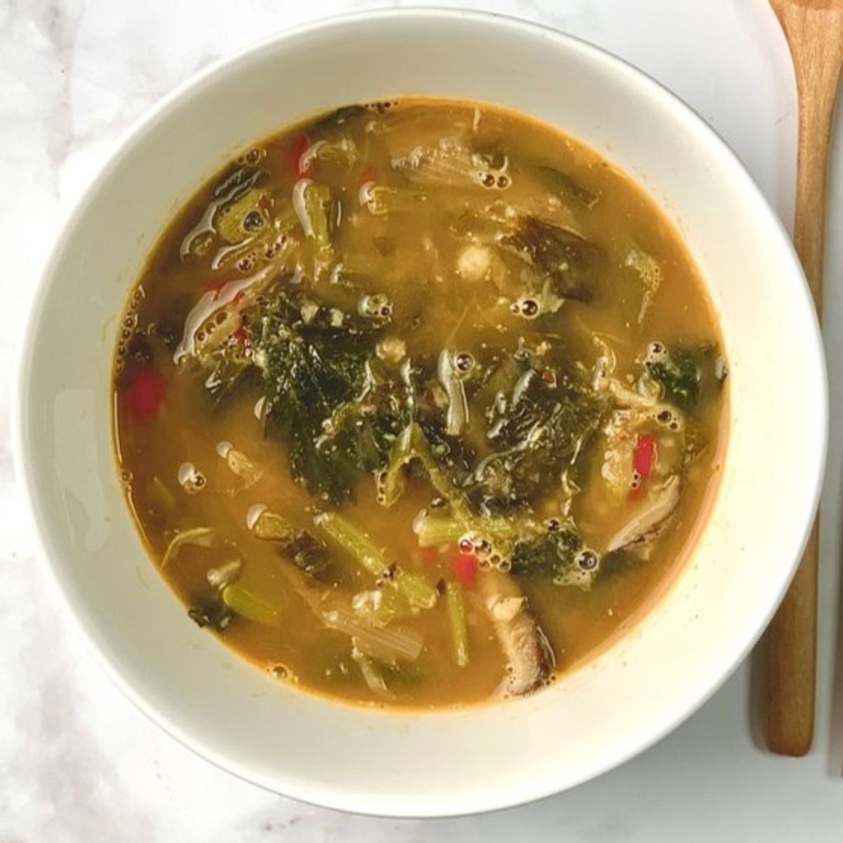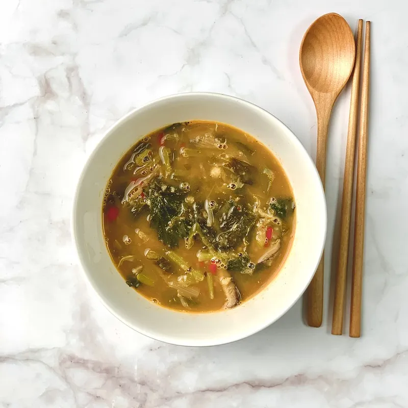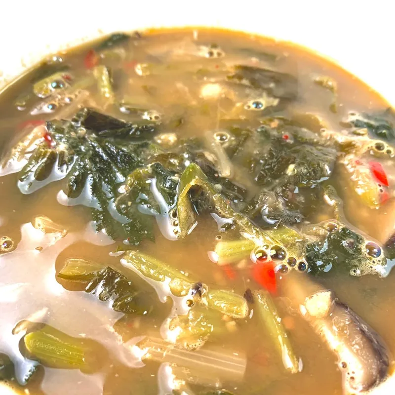 여기에 말린 시래기가 아닌 생 무청과 단배추를 사용하여 부드러운 식감을 더했습니다.