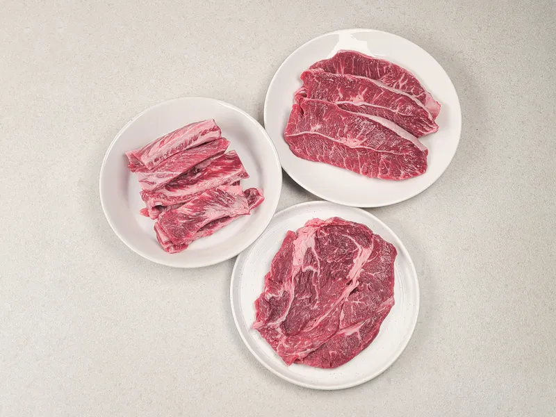 갈빗살은 갈비뼈 사이사이 살코기로 쫄깃한 식감과 고소한 감칠맛이 일품이고, 소 목등심은 담백한 목심과 마블링 좋은 윗등심이 함께 붙어 쫄깃한 식감과 풍부한 육즙을 자랑해요! 부챗살은 지방이 적고 육즙이 풍부하여 부드러운 육질과 힘줄에서 퍼져 나오는 마블링이 돋보입니다.