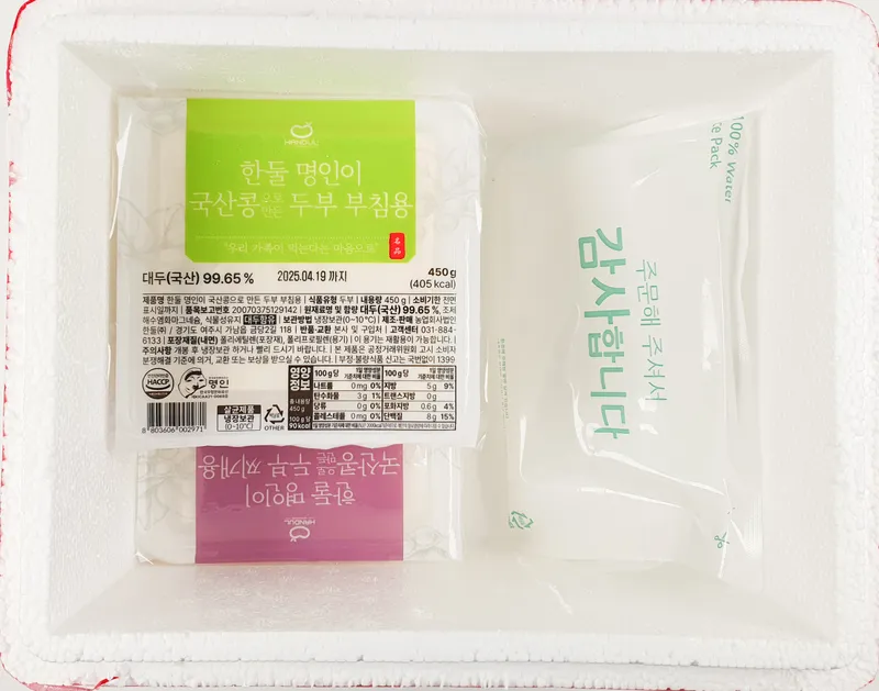 명인이 정성으로 만든 국산콩 모두부 2종입니다. 국산콩 99.65%를 함유해 콩 본연의 고소한 맛이 살아 있고, 안심하고 드실 수 있는 건강한 두부예요.