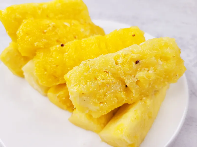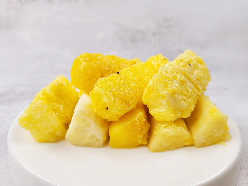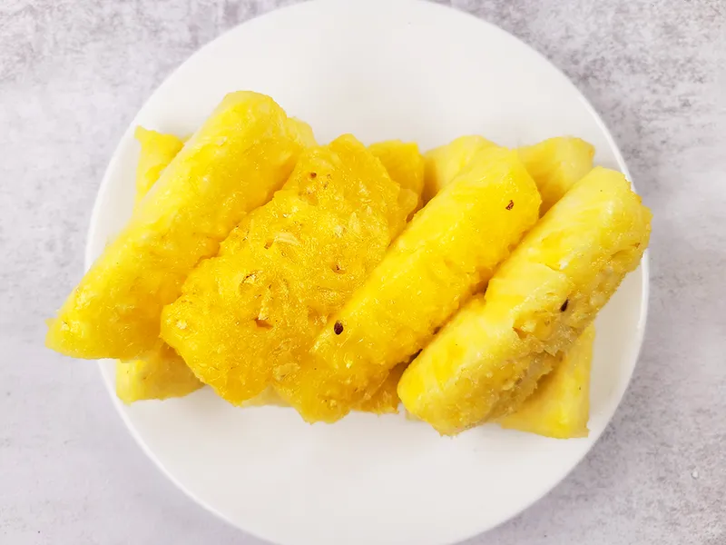 두꺼운 파인애플 껍질을 깔끔하게 제거했습니다. 먹기 좋게 손질해서 보내드려요. 직사각형 형태로 컷팅해 젓가락에 끼워 드시면 깔끔하게 간식 시간을 즐길 수 있답니다.
