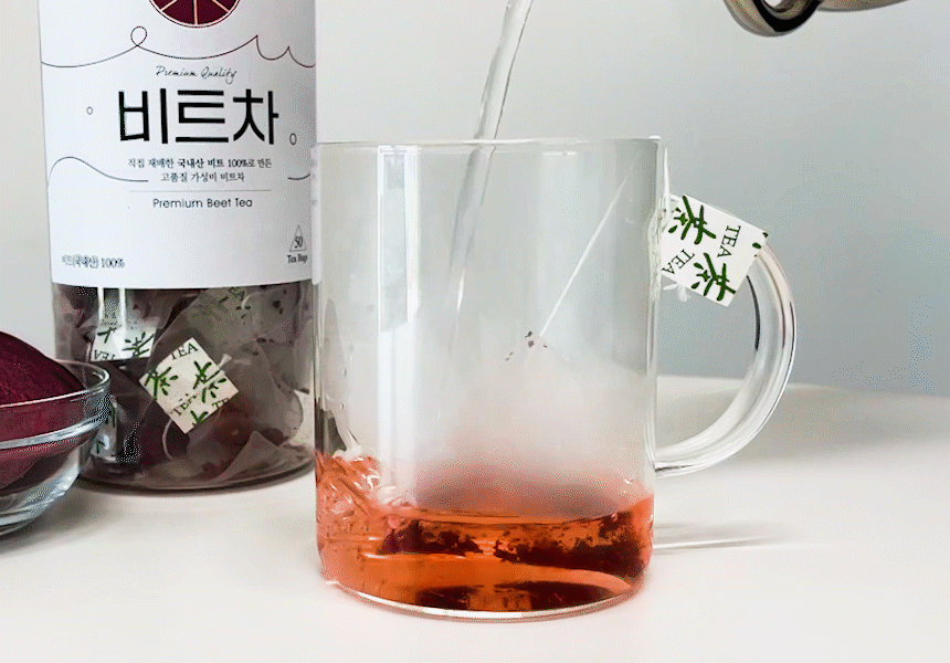 국내산 레드비트로 만든 비트 차예요. 남녀노소 모두가 즐길 수 있는 구수하고 달큼한 맛이랍니다. 영롱한 붉은 빛으로 색감도 참 예뻐요.