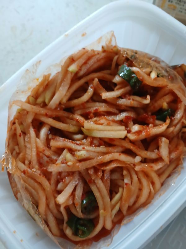 반찬가게에서 사는 달달한 무생채 아니라서 좋습니다. 젖갈맛이 있고 간이 좀 있는 편인데 밥에 넣고 비벼먹으니 아주 맛있네요