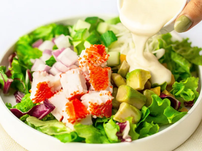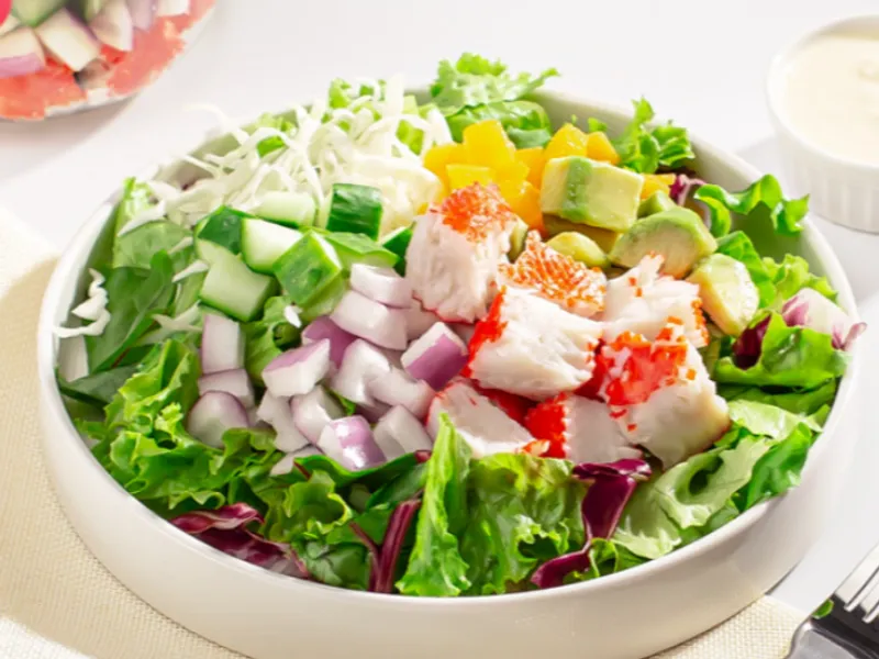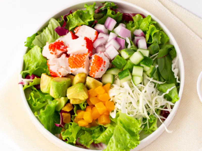 가볍고 신선한 재료들로 만들어져 부담 없이 즐기기 좋은 샐러드입니다. 탱탱한 꽃맛살이 들어가 부드럽고 쫄깃한 질감이 독특한 매력을 준답니다. 거기다 신선한 채소와 과일이 들어가 상큼한 맛이 두 배! 가벼운 식사로 즐기셔도 좋고 입맛 돋워주는 애피타이저로도 탁월해요.
