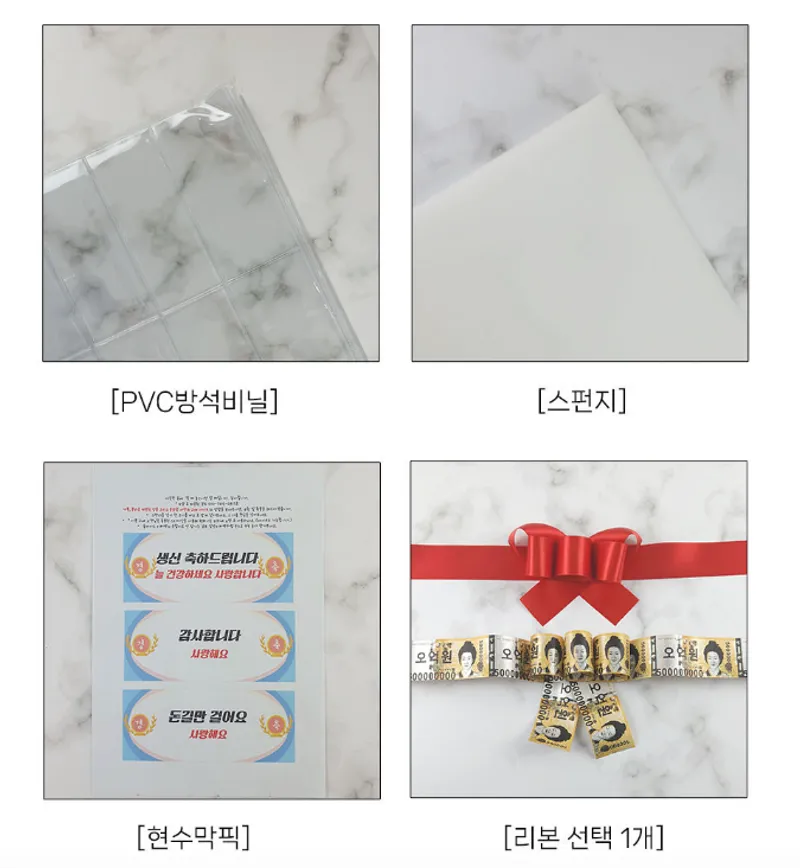 PVC방석비닐, 스펀지, 현수막픽(택 1), 리본(택 1)로 구성되어 있습니다.