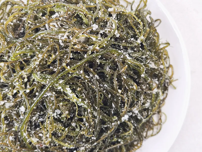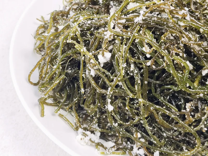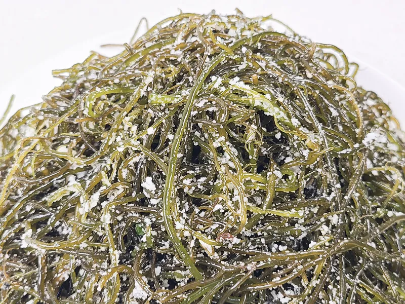 가늘고 길쭉한 해조류로, 국내산 원물을 염장해 준비했어요.
