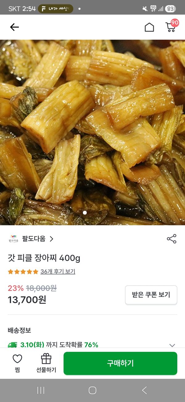 포장상태 양호하고 갓 피클이 시원하고 맛있어요~~