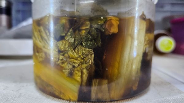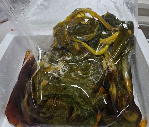 갓 특유의 냄새와 맛이 새콤한 맛과 어우러진 맛있는 피클이네요 모양새는 우거지 같이 생겼는데 하나도 질기지 않고 아삭하기도 하네요 족발 먹을때 곁들여 먹으니 잘 어울렸어요 밥반찬로도 좋아요